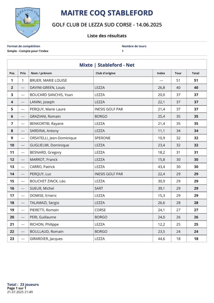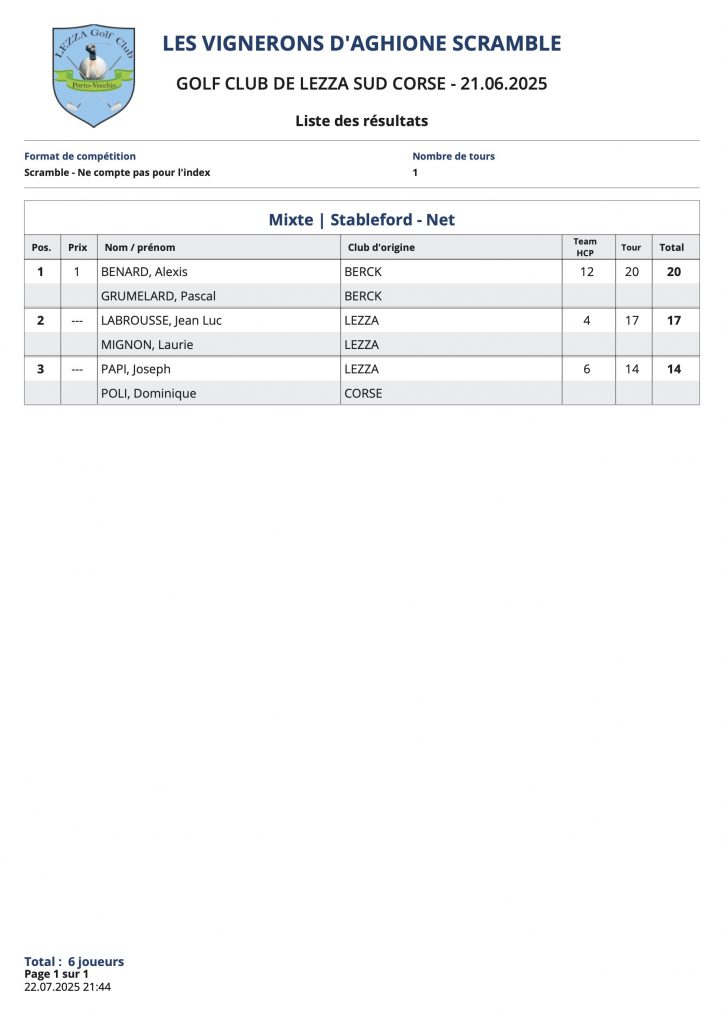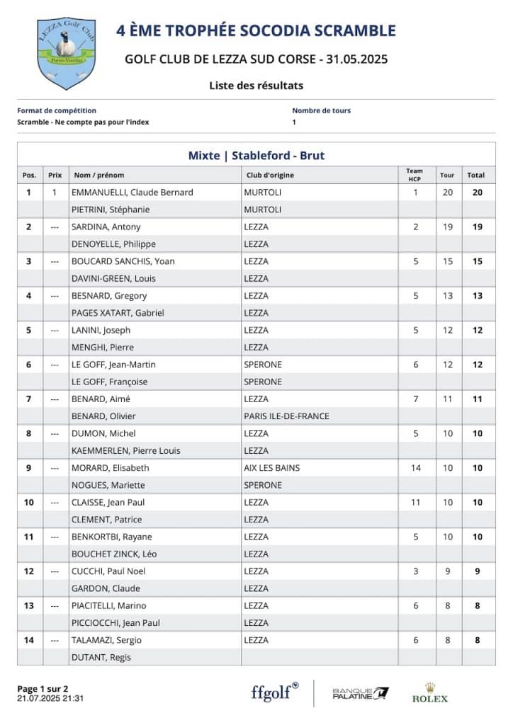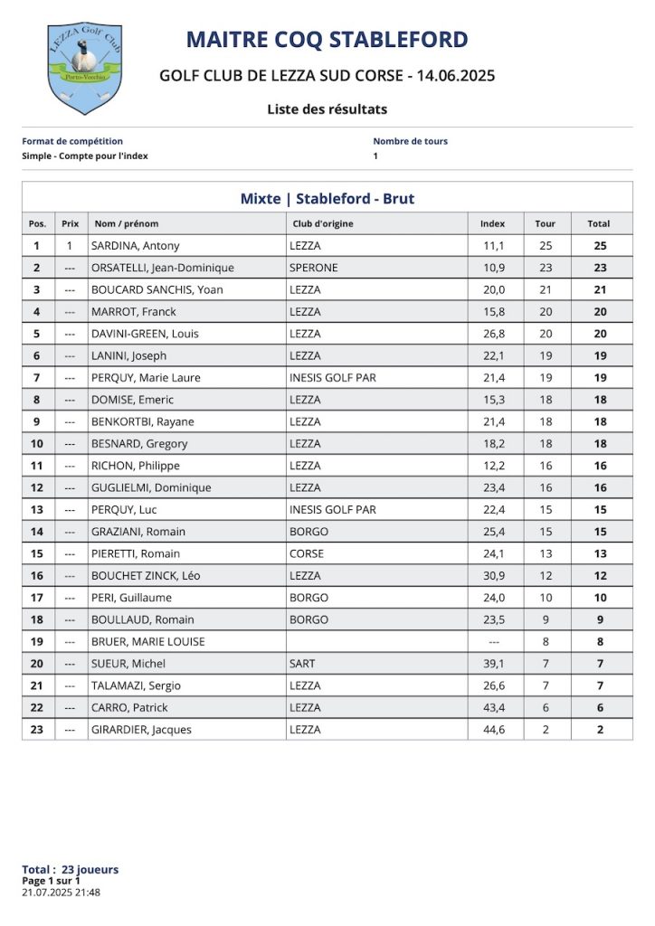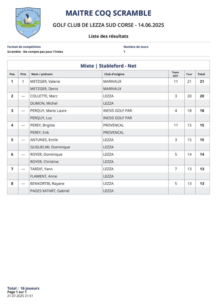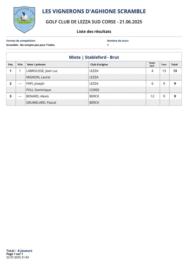 L’article Résultats Coté Golf est apparu en premier sur Golf Club de Lezza.