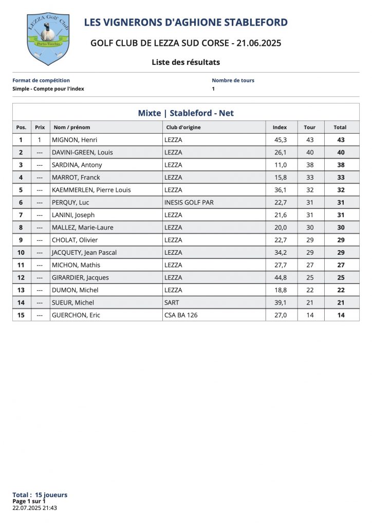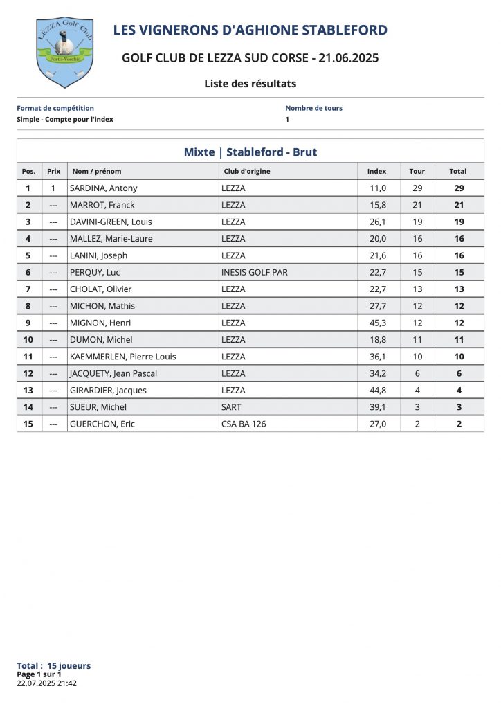 L’article Résultats Vignerons d’Aghione est apparu en premier sur Golf Club de Lezza.