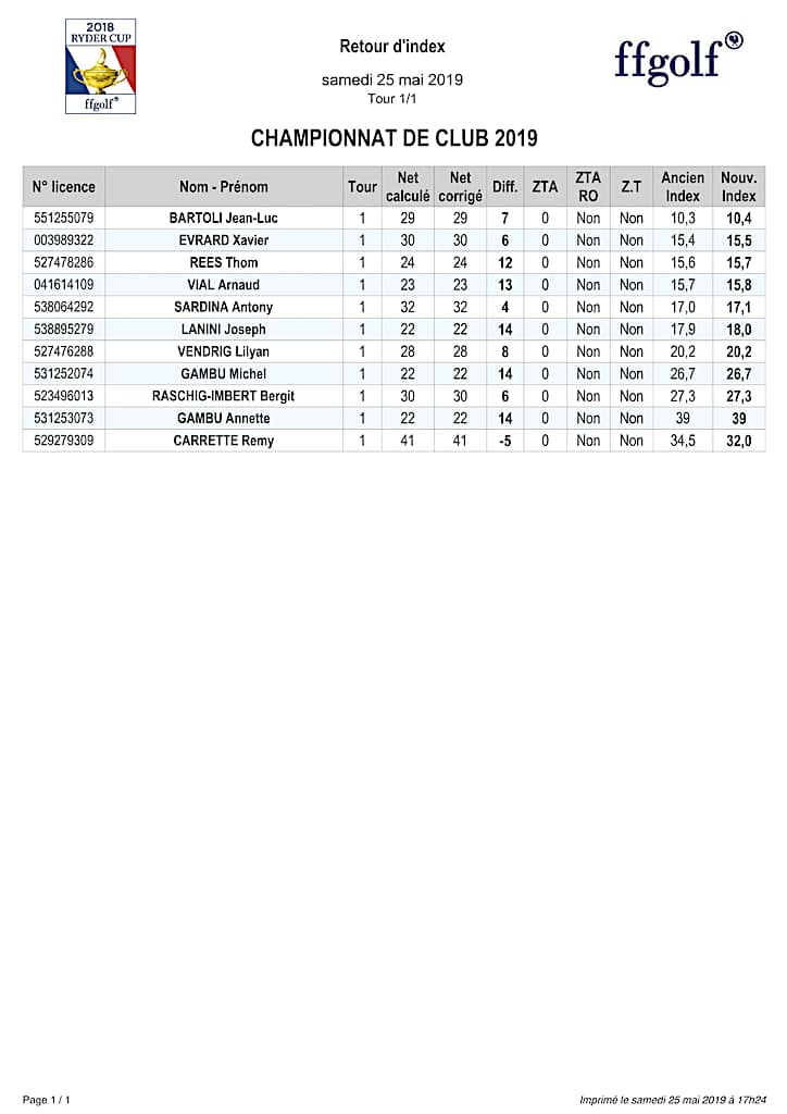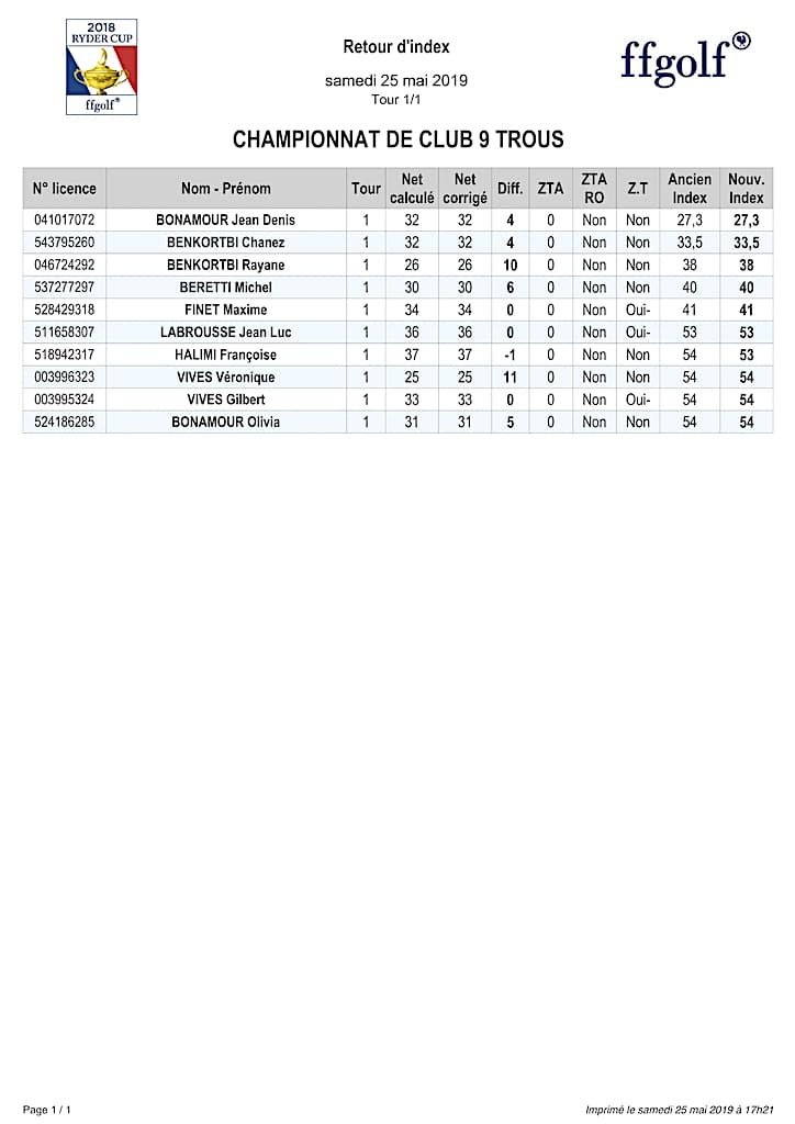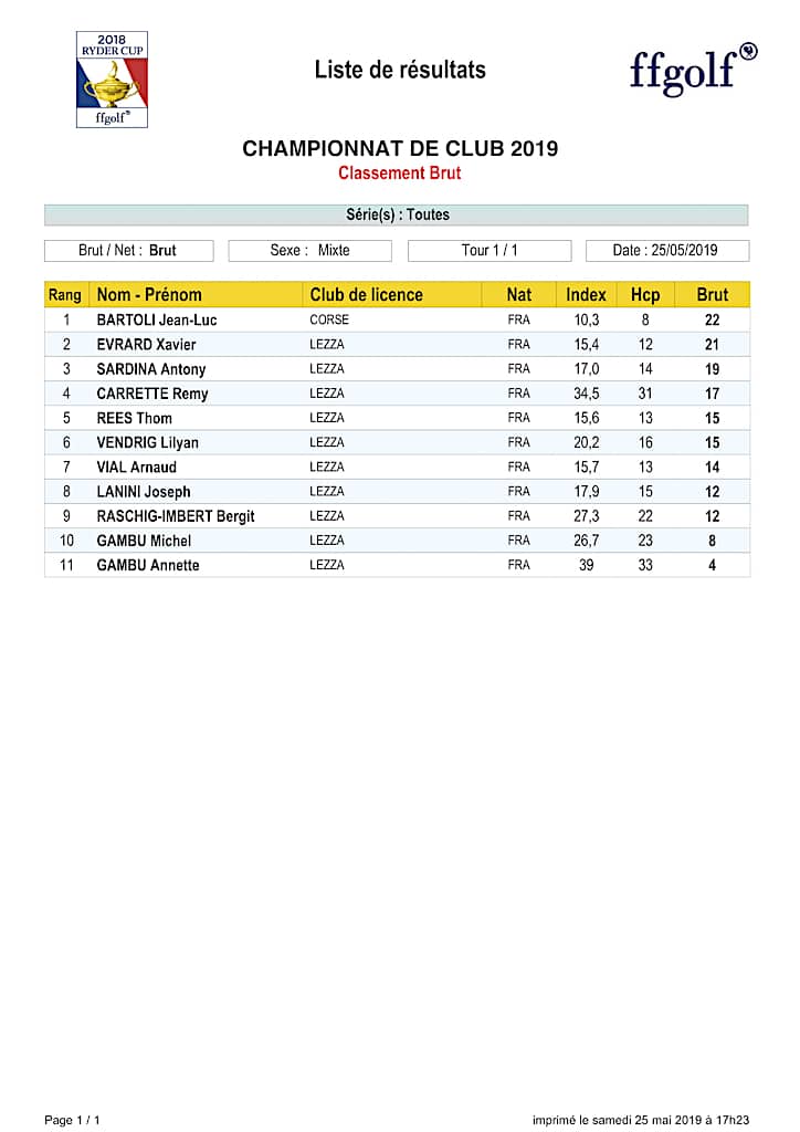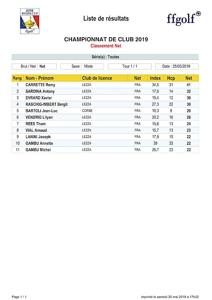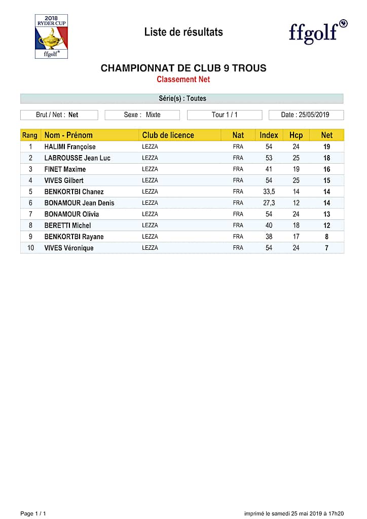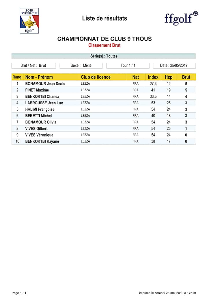 Veuillez trouver ci-dessous les résultats du Championnat du Club qui a eu lieu le Samedi 25 Mai 2019.