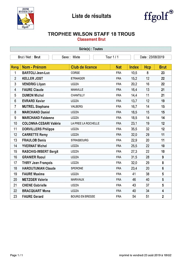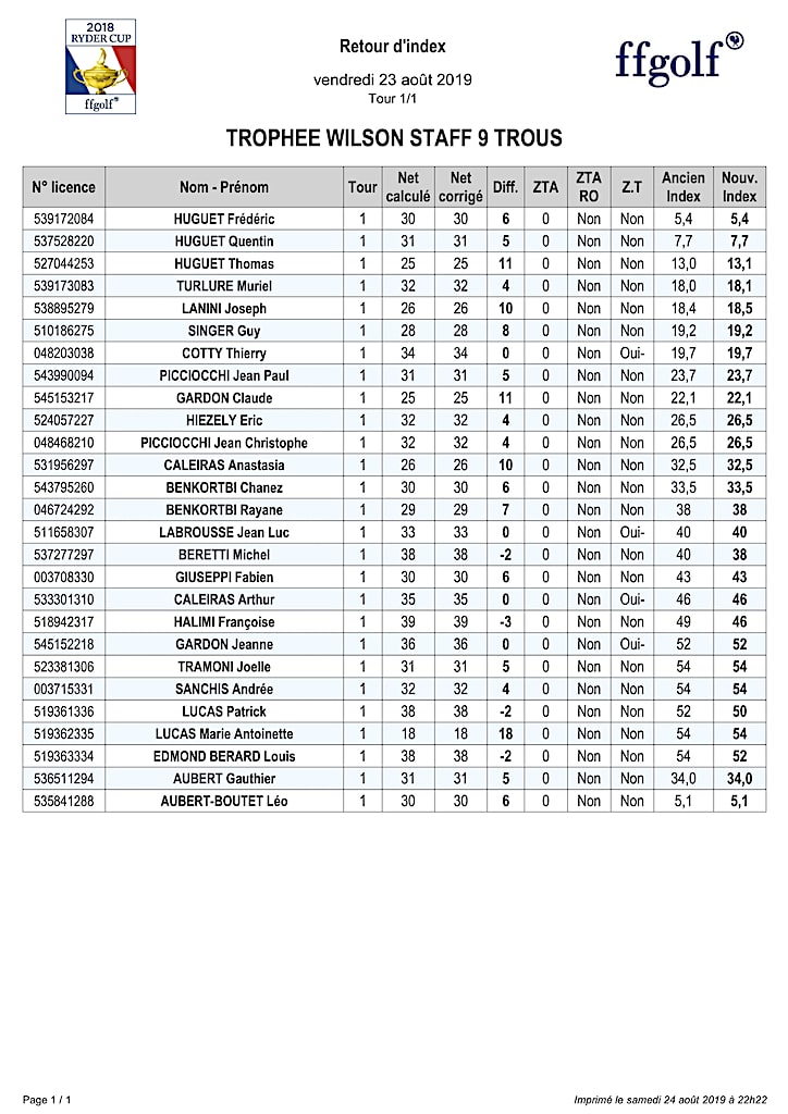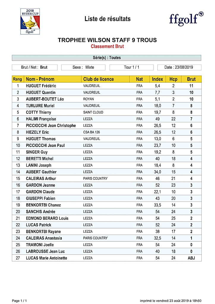 Veuillez trouver ci-dessous les résultats de la « Coupe Wilson » qui a eu lieu le Vendredi 23 Aout 2019.