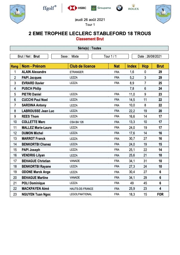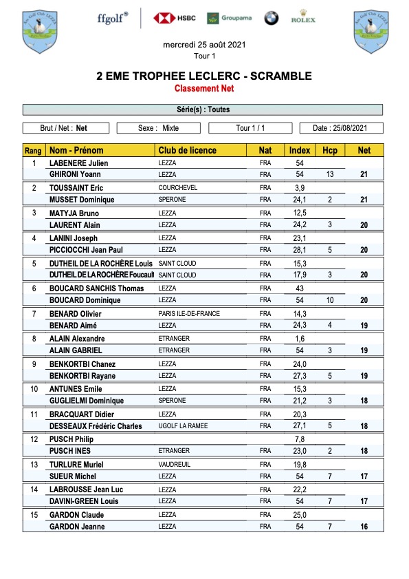 Veuillez trouver ci-dessous les résultats du Trophée Leclerc qui a eu lieu le Jeudi 26 Aout 2021.